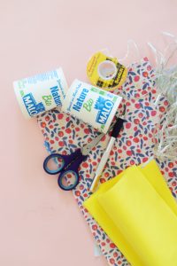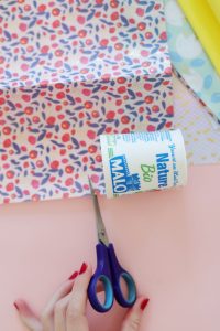 Etape 1 : On découpe une bande de papier décopatch d’environ 10 cm de large sur 20 cm de long (on peut s’aider du pot de yaourt Malo pour prendre les repères).