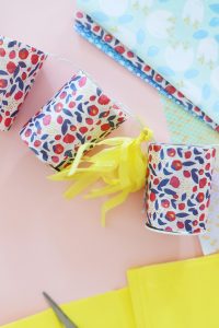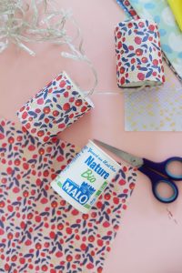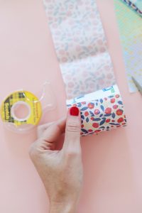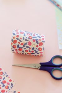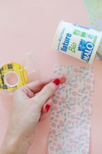 Etape 2, 3 et 4 : On fixe le papier avec du scotch double face en faisant tout le tour du pot et l’on peut couper les bandes de papier qui dépasse pour qu’il soit bien ajusté.