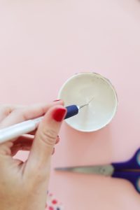 Etape 5 : A l’aide d’un cutter (et d’un adulte) on vient percer le fond du pot en réalisant une petite croix.