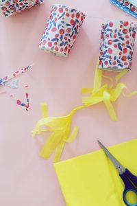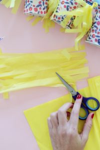Etape 8 : On prend une feuille de papier de soie et on la plie en deux afin de découper des franges d’un côté et de l’autre sans remonter vers le haut.