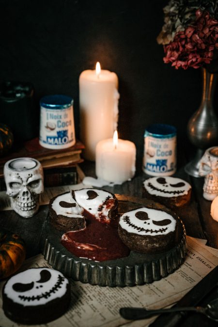- Décorez selon vos envies, ici j’ai utilisé du chocolat fondu afin de réaliser le visage de Jack dans le film « L’Etrange Noël de Monsieur Jack ».